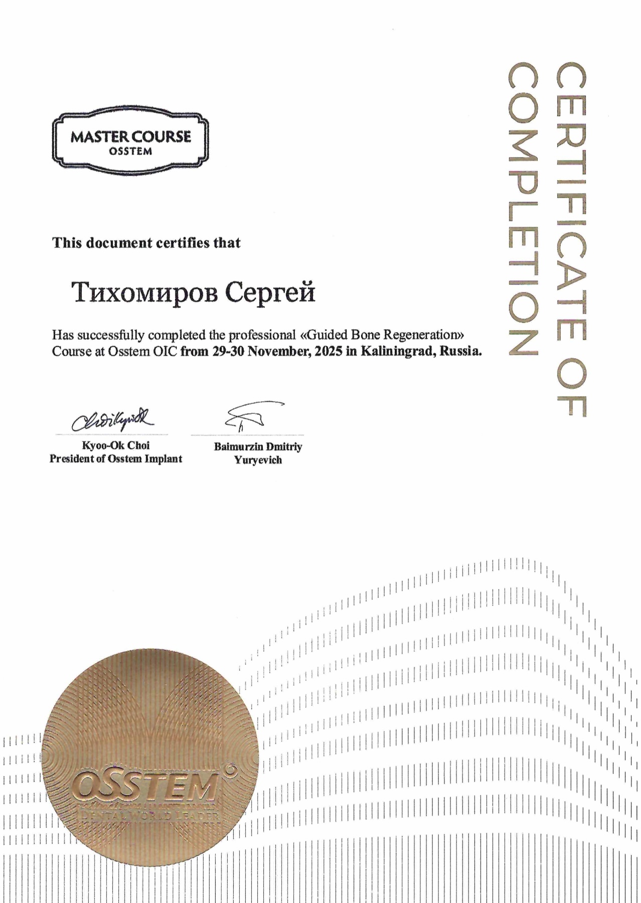 • 2025 год Сертификат, прошел обучение в рамках семинара «Osstem OIC», Калининград